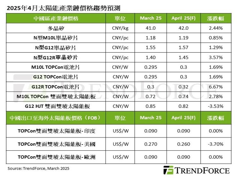 根據TrendForce最新調查,中國政策刺激太陽能產業整體需求,增添太陽能板供給緊張氣氛,預期2025年三月和四月的需求將出現小高峰,可能順勢帶動第二季產業鏈價格上升。
