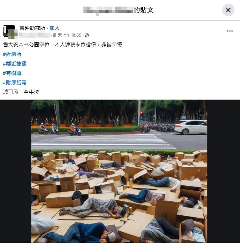 貼文一出2.4萬人朝聖,留言超過1200則,許多人紛紛留言表示,「居然還有人住得起市中心精華地帶,我們內科次等公民只能去搶大湖公園了」「謝謝美國的帽子戲法,把財富都轉到特定的做手上,平民淪落更窮了」「連假就是要讓我們去公園找空位」「看這情形,明天紙類股會逆勢上漲」「能睡大安區的也算是頂級上流街友了」「你各位記得衣服裡面要塞報紙,可以保暖」
