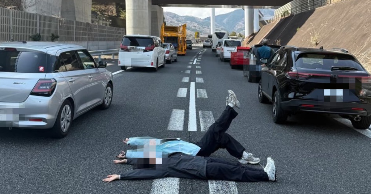 【悲報】訪日中国人が交通妨害、高速道路が渋滞中に道路の真ん中で寝そべる*道路で寝そべることは道交法第76条で禁止行為、5万円以下の罰金 pic.twitter.com/1sPbwEwYMU