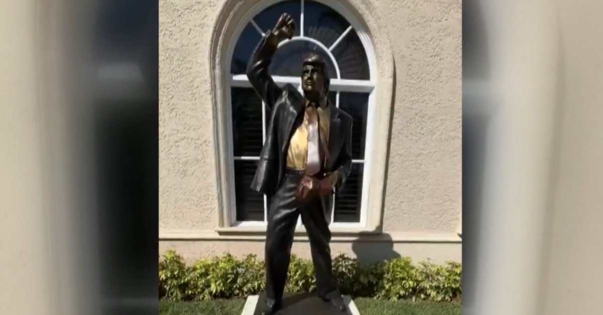 支持者送川普新的銅像,就放在他位於佛州的高球俱樂部門口。(圖/翻攝自X)