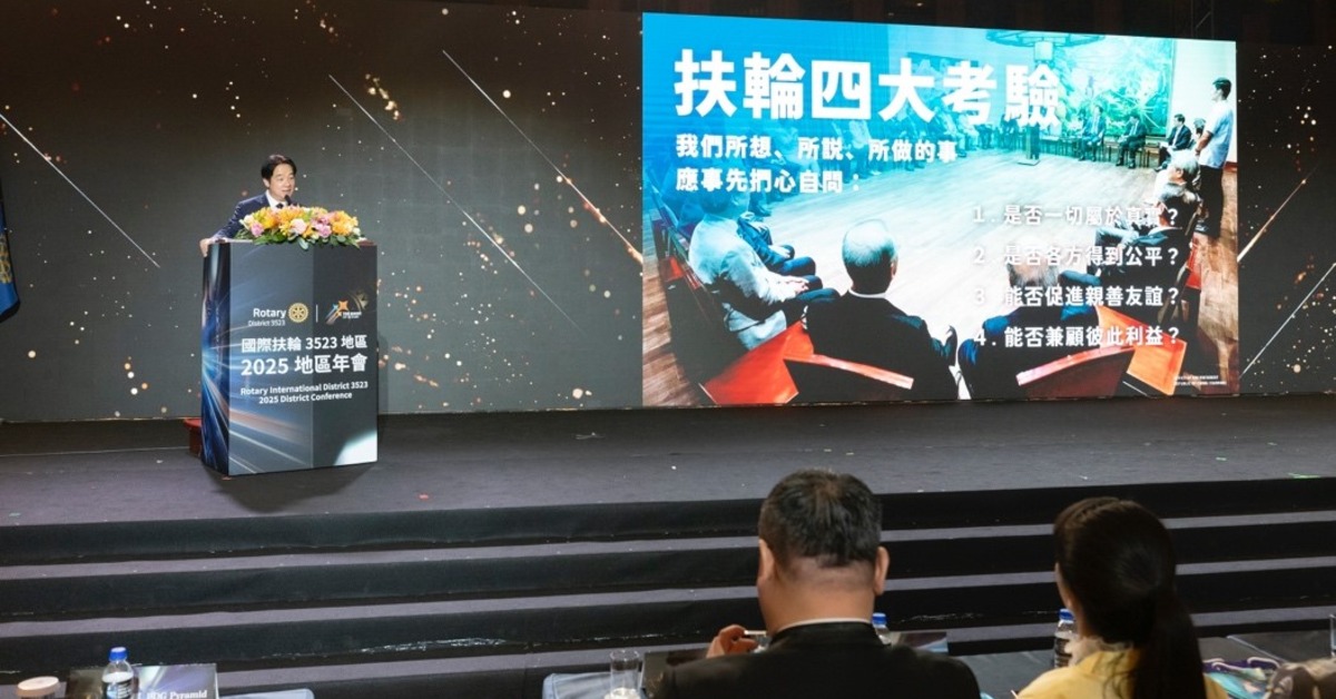 賴清德總統蒞臨致詞,總統以扶輪「四大考驗」為引。(圖/國際扶輪3523地區提供)