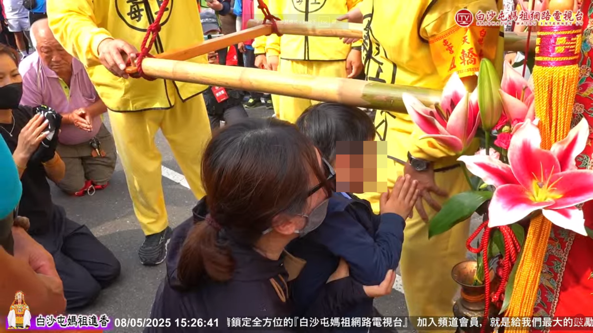 白沙屯媽祖今(8)日回鑾途中,吸引大批信徒沿途迎駕。其中,一名信徒在上午9時59分抱著年幼、尚不會說話的孩子,情緒激動落淚,場面令人動容。