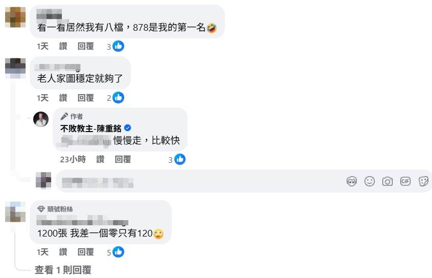 貼文一出,掀起一波討論,「老師,我有30張可以退休了嗎」、「老人家圖穩定就夠了」、「1200張,我差一個零只有120」、「這支很棒,繼續存!」、「一開始就投資快2千萬了…資本雄厚」、「真羨慕安穩的利息」、「我也要努力賺用力存」、「也要有閒錢買才行…」、「真羨慕,我這小資族,退休設定能年收入120萬就滿足了」、「這次配息可以的」。