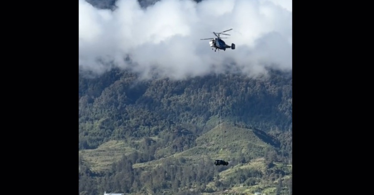 直升機緩緩進入山谷,上頭吊掛著的,居然是一輛新車。印尼東部巴布亞高原,一名車主買了新車,但能夠看到周遭環山圍繞,在當地運輸困難,因此這名富豪果斷砸錢,租下直升機,直接把車空運回家。