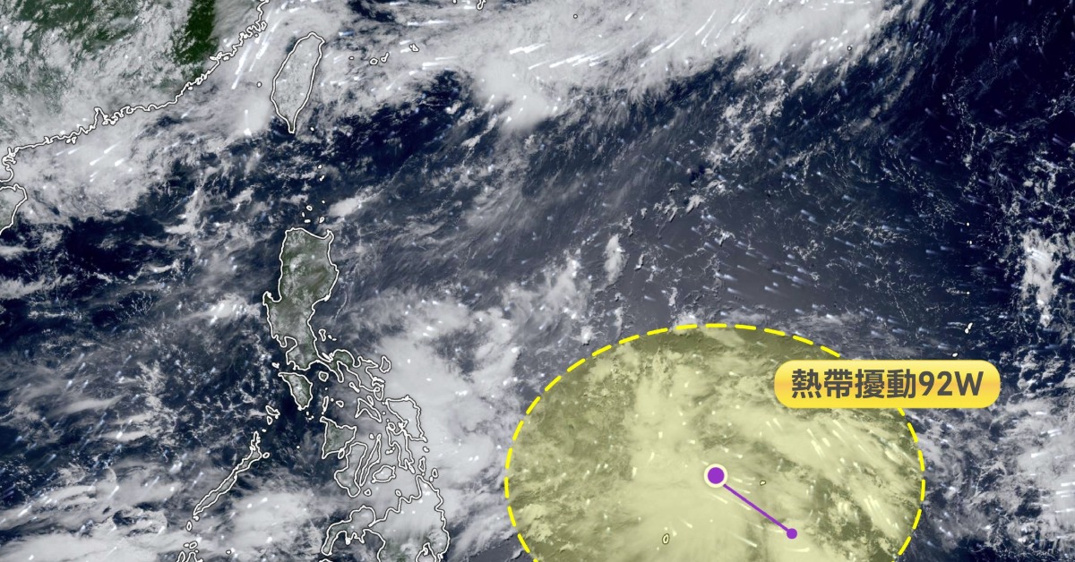 此外,臉書粉專「停班停課最新通知 Taiwan Alerts」表示,據聯合太平洋警報中心(JTWC)資料顯示,位於菲律賓東方海域、帛琉附近的低壓系統已獲編號92W,目前位處海溫達30-31°C的海域,環境中等至有利於發展,未來幾天有很高機率會逐步發展並增強。