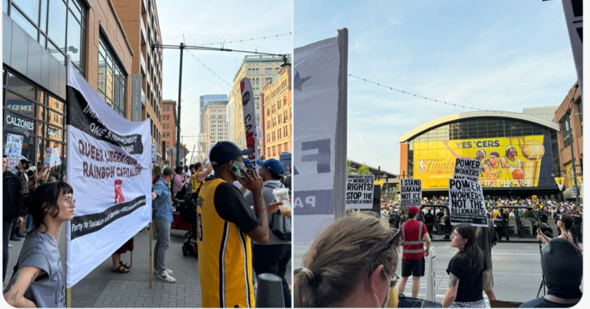 #HappeningNow: About 70 anti-ICE protesters gathering outside Gainbridge Stadium of NBA Finals game. “Today’s the perfect day to do it,” said one protester handing out flyers to Pacers fans. @indystar @IAMJADEJACKSON @1NoePadilla pic.twitter.com/zwxW3URx3E