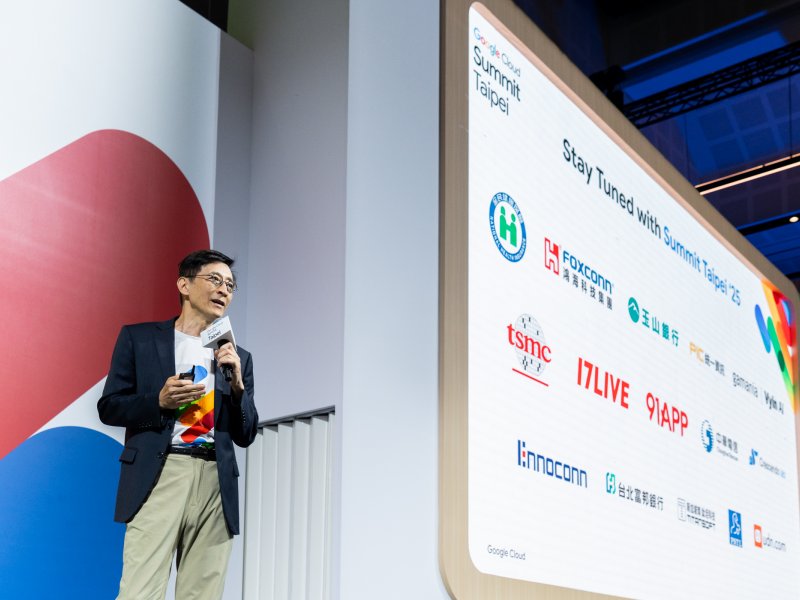 Google Cloud台灣總經理陳愷新於Google Cloud Summit Taipei現場介紹漸強實驗室入列Google Cloud合作夥伴。(漸強實驗室提供)