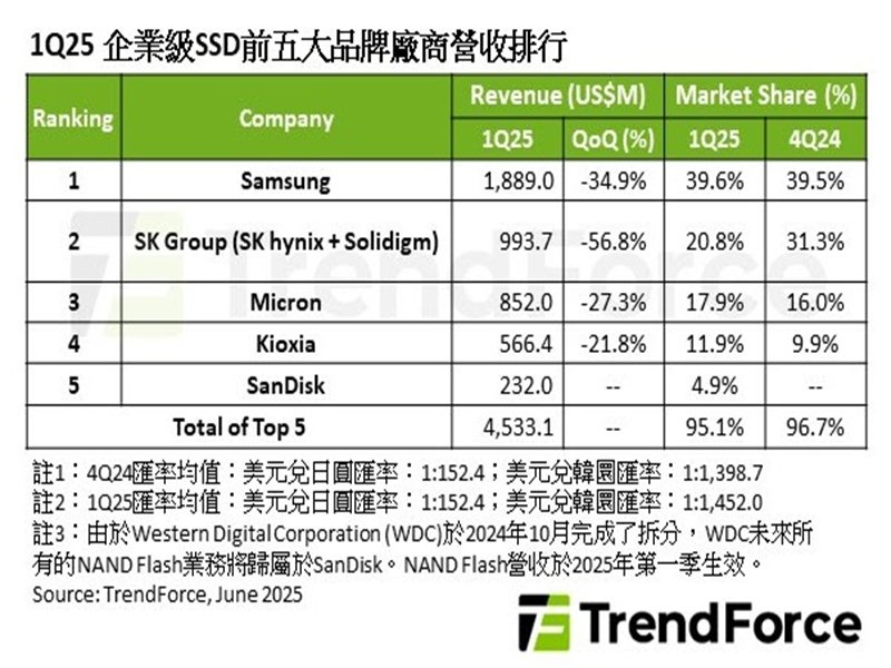 營收第二的SK Group(SK hynix及Solidigm)因主要客戶在AI基礎建設的策略調整,第一季營收衰退超過50%,降至9.9億美元。該公司正加速下一代儲存技術的研發與佈局,並開發新一代PCIe 5.0 TLC及QLC SSD,積極轉型。