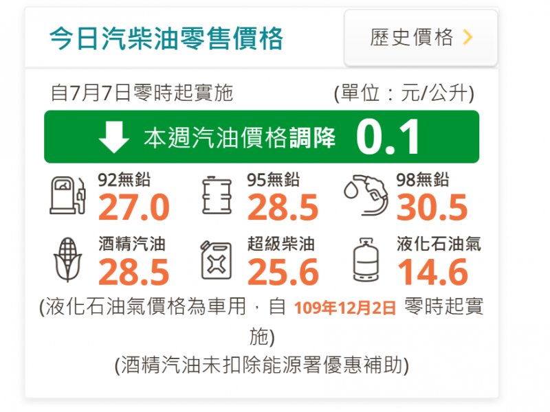 台灣中油公司表示,自明(7)日凌晨零時起汽、柴油各調降0.1元及0.3元,參考零售價格分別為92無鉛汽油每公升27.0元、95無鉛汽油每公升28.5元、98無鉛汽油每公升30.5元、超級柴油每公升25.6元。
