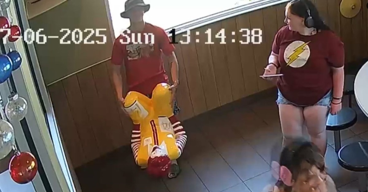 監視器畫面中,一名戴著帽子的紅衣男子,直接抬起跪坐姿態的麥當勞叔叔雕像,就這樣光明正大從店內將它抬了出去,和其他3人一路跑向停車場的黑色休旅車,之後上車離開現場。
