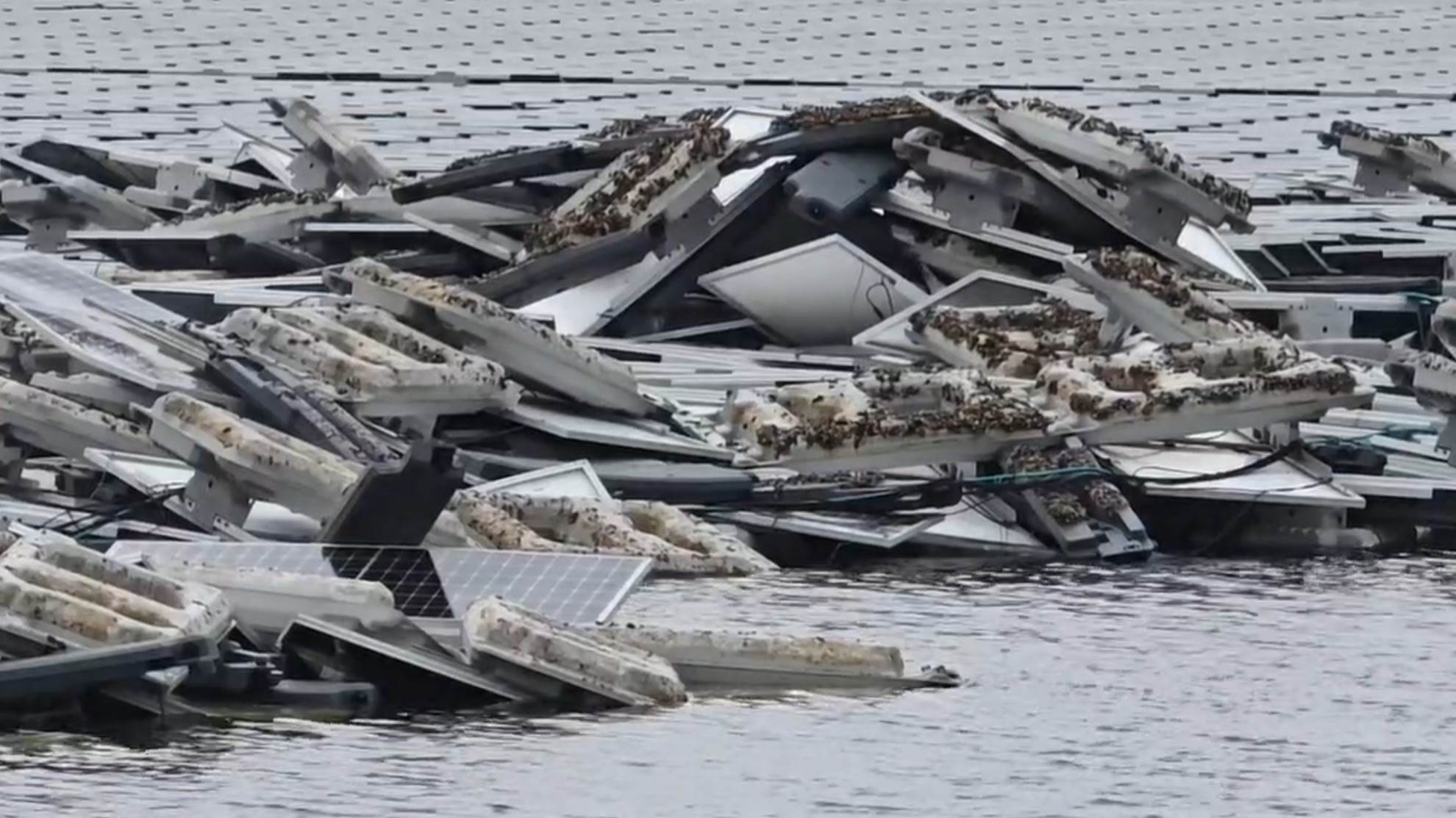 丹娜絲颱風過境,加上低壓帶、西南風影響,狂風暴雨造成嚴重災情。不只造成屏東佳冬鄉外海太陽光電系統浮台「打水漂」,成海廢漂流超過1公里,嘉義新塭太陽能板同樣受損嚴重。空拍畫面拍下光電板的殘骸漂浮在水面,滯洪池淪為垃圾場,慘烈畫面震撼各界。