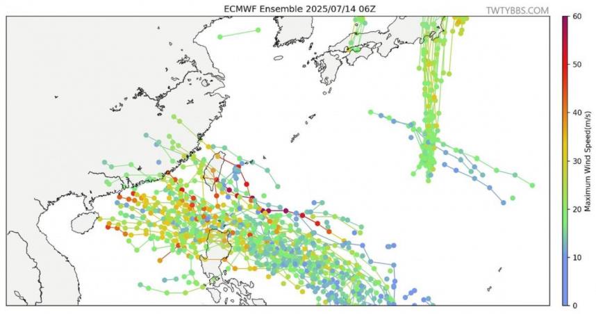 氣象粉專「台灣颱風論壇|天氣特急」昨(14日)晚也發文指出,關於傳說中的週末颱風低壓雛形還在醞釀中,目前預報仍以「通過巴士海峽」的機率最高,至於是否侵襲台灣,要看擾動形成的位置以及大低壓帶內的角力、與副熱帶高壓互動的狀況而定。󠀠