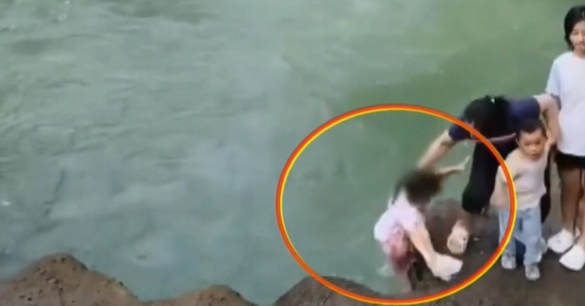 中國這名媽媽,一家人在岸邊拍照。媽媽顧著抓住兒子,卻不慎把女兒推落水中。直擊搶救的驚險畫面,當時水流,非常強勁,女孩一度失去蹤跡。還好最後幸運地被見義勇為的遊客,和安全員救起。