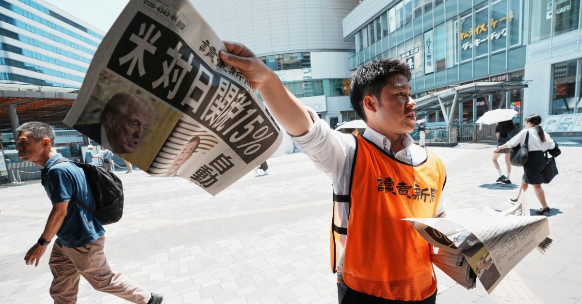一名工作人員分發《讀賣新聞》的增刊,內容為川普於7月23日在東京宣布與日本達成貿易框架協議,新聞標題為「美國將對從日本進口的商品徵收15%的關稅」。(圖/美聯社)