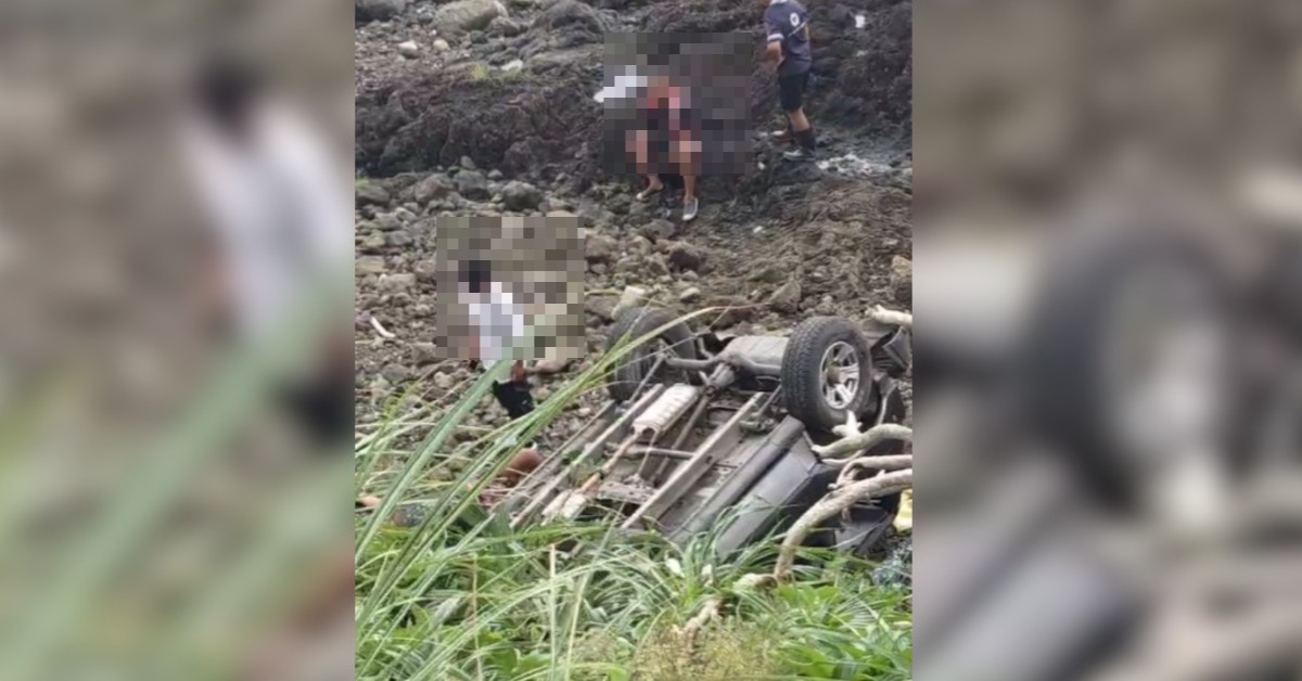 據了解,車上共有2名當地民眾,事故發生後都已自行脫困,幸好僅受輕傷,一名穿著黑色上衣跟短褲的男子,因為突如其來的事故而飽受驚嚇,躺在草叢中遲遲未起身。後已由救護人員送往當地衛生所治療,無生命危險。