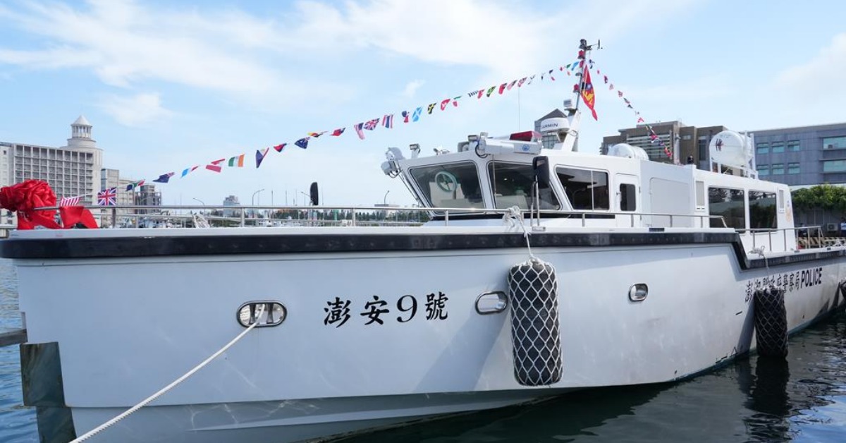 澎湖縣警察局全新建造「澎安9號」警艇,6日舉行啟航,由澎湖縣長陳光復、議長陳毓仁等人見證下,祈禱擲吉後順利啟航。(圖/澎湖縣政府提供)