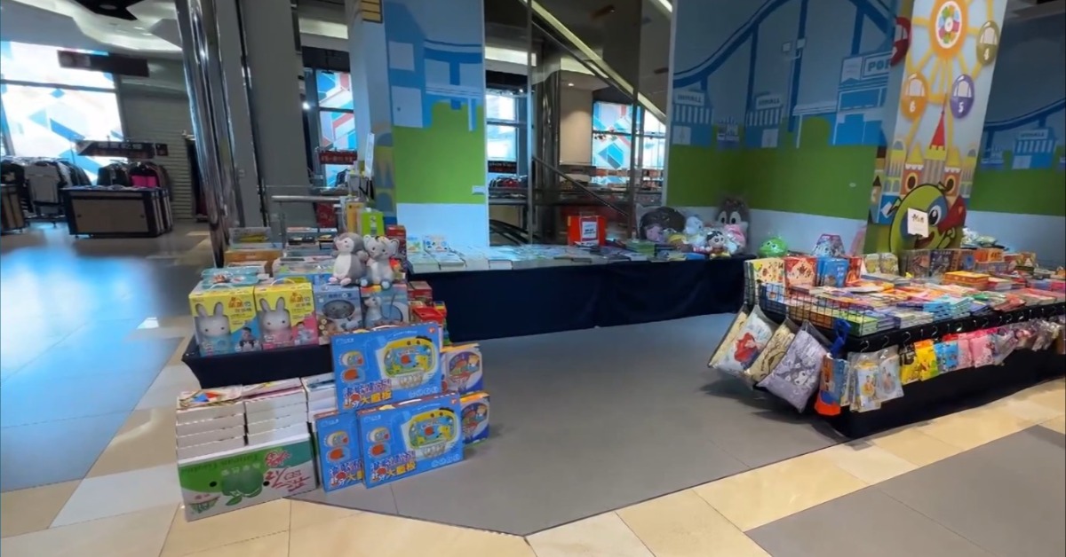 板橋這間百貨公司,營業時間一到,逛街顧客稀稀落落,多數櫃位撤光光,只剩下賣雜物、賣生活用品的臨時花車;繼續往上走還有連鎖電子遊戲場,但遊玩客人稀少,櫃台告示牌還寫下「月底就將結束營業」。