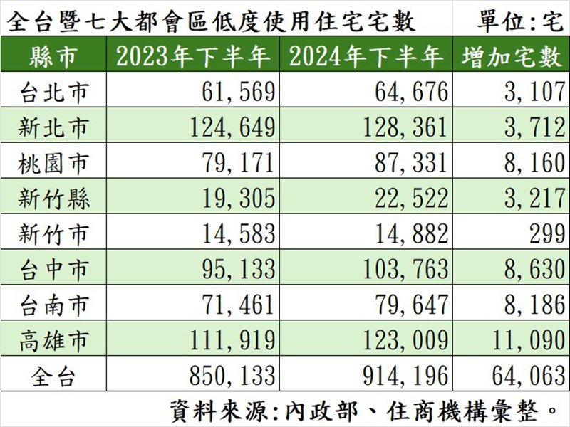 全台暨七大都會區低度使用住宅宅數。(住商提供)