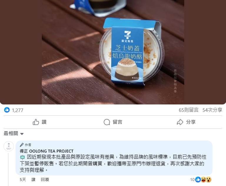 得正與7-11合作推出聯名甜點「芝士奶蓋焙烏龍奶酪」無預警下架。(圖/翻攝自得正臉書)