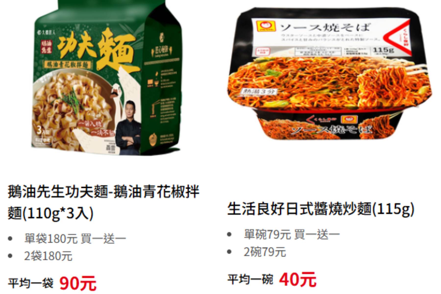 全聯的本檔期(8/15-8/28)買一送一優惠,包含多種零食飲品到南北貨、麵條、調味料等還有個人及居家清潔用品,連寵物用品也有包含在本檔期優惠中。在全聯本次優惠品項中,原價一碗79元的生活良好日式醬燒速食炒麵在優惠活動中一碗僅需要40元;鵝油先生功夫麵-鵝油青花椒拌麵一袋3包原價180元,在買一送一優惠後一袋只需要90元。
