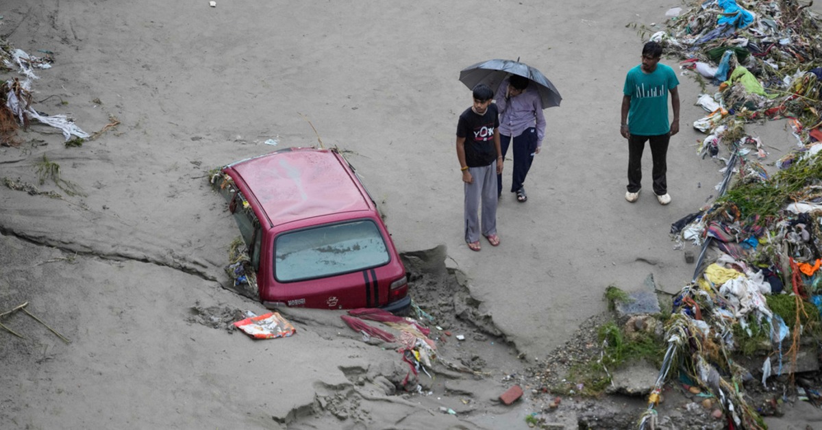 印度查謨的塔威河岸,洪水過後,人們站在一輛被泥巴困住的汽車旁。(圖/美聯社)