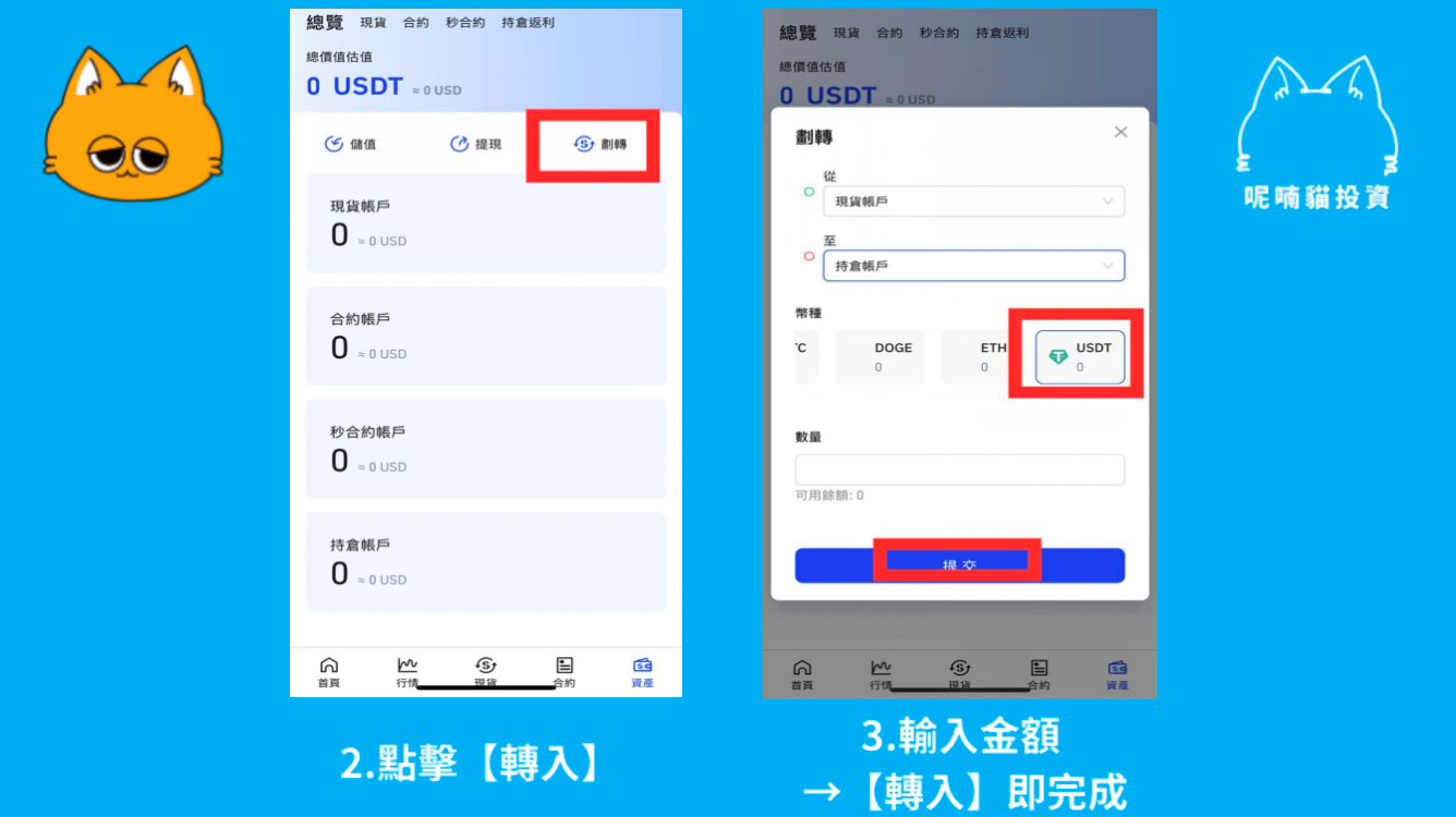 點擊【資產】→輸入金額→【從現貨賬戶轉入持倉賬戶】即完成