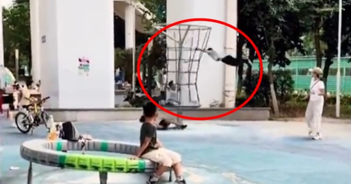 幾名小朋友玩盪鞦韆,一名男童竟然站在鞦韆的靠背上,隨著鞦韆越盪越高,慣性導致男童整個人翻轉一圈。重摔在地上前還被鞦韆打到,同伴見他已經倒在地上,仍在嬉戲,過了一會才知道事情的嚴重性。