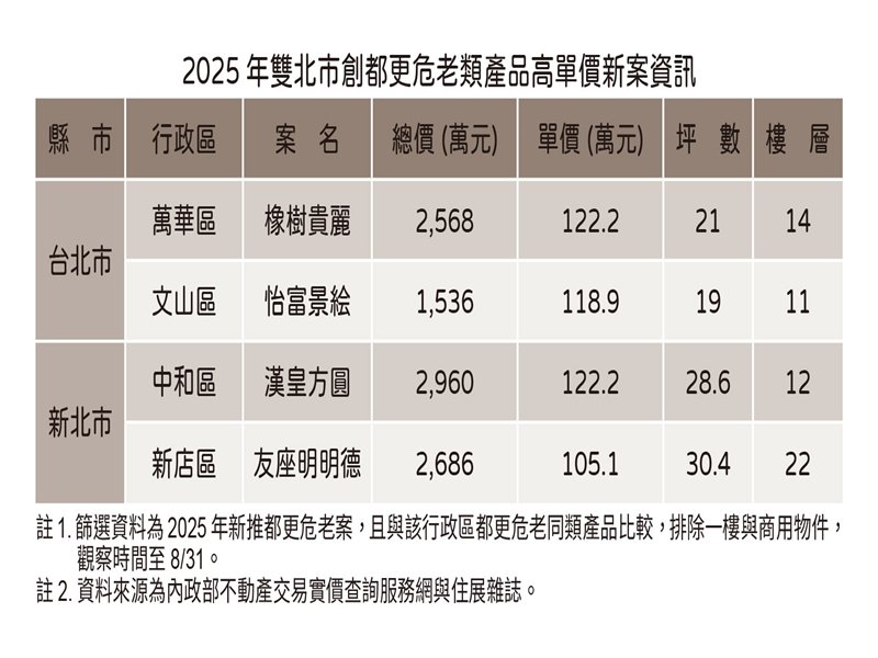 近期房市多項限制調整,都更危老開發也被討論是否應排除房貸管控以外,住展雜誌彙整實價揭露資訊,在與同樣是都更危老案比較下,今年雙北市新推都更危老案共計4案創下區域新高,台北市為萬華區的「橡樹貴麗」、文山區的「怡富景絵」,單價分別為122.2萬元與118.9萬元;新北市是中和區的「漢皇方圓」和新店區的「友座明明德」,單價各是122.2萬元、105.1萬元,其中「怡富景絵」業已完銷,而「漢皇方圓」、「友座明明德」則在不論是否為都更危老案的比較,均為區域最高價,改建後價值如此之高,無怪乎攸關開發整合順利與否的貸款限制受到強烈關注。