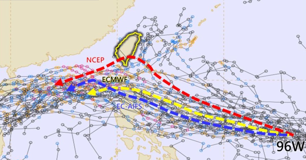 熱帶擾動96W預估將在週末生成為第24號颱風「風神」(Fengshen),氣象專家指出,各國預測路徑仍相當分歧,其中美國NCEP模式預測恐侵襲台灣,不論是否登陸都要注意和東北風產生的共伴效應,造成額外降雨。